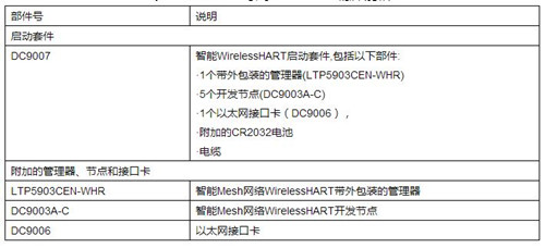 对于一些欲开发自己的WirelessHART产品的厂商来说,可考虑直接采用国外厂商为此目的提供的启动套件。如LINEAR公司下属的Dust Networks 公司,他是WirelessHART无线网络芯片SmartMesh WirelessHART Embedded Products(智能Mesh网络WirelessHART 嵌入式产品)提供商,已经为包括艾默生过程管理公司在内的厂家提供了网关、节点、接口卡等产品使用的芯片。如果是初次接触WirelessHART无线网络技术,则可使用该公司可提供智能WirelessHART启动套件(见图3),套件包括的产品见表1。全套价格在1000美金以下,的确是非常便宜的。